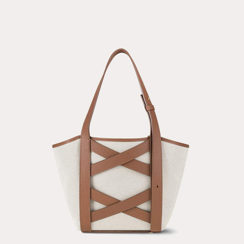 This sculptural basket bag, filled with soft curves, delights with two magical transformations. It can take the form of a basket with open sides or transform into a pouch after fastening the internal snap hooks. Its handle is adjustable with knobs. It can have two lengths, for the shoulder or for the hand. The leather straps on the bag, arranged in a subtle crossover, refer to traditional motifs used in wooden architecture.