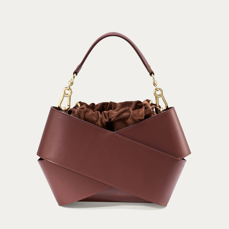 The bag's form, created from two pieces of leather wrapped around each other, attracts attention with its modern look. Inside, a loosely placed pouch effectively protects the contents from accidentally falling out. Furthermore, the pouch can be easily replaced, allowing you to personalize the bag and give it a new look. The bag comes with a shoulder strap for comfortable carrying and an elegant handle with gold hardware. It's elegant yet practical.