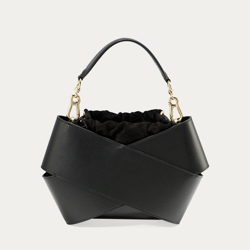 The bag's form, created from two pieces of leather wrapped around each other, attracts attention with its modern look. Inside, a loosely placed pouch effectively protects the contents from accidentally falling out. Furthermore, the pouch can be easily replaced, allowing you to personalize the bag and give it a new look. The bag comes with a shoulder strap for comfortable carrying and an elegant handle with gold hardware. It's elegant yet practical.